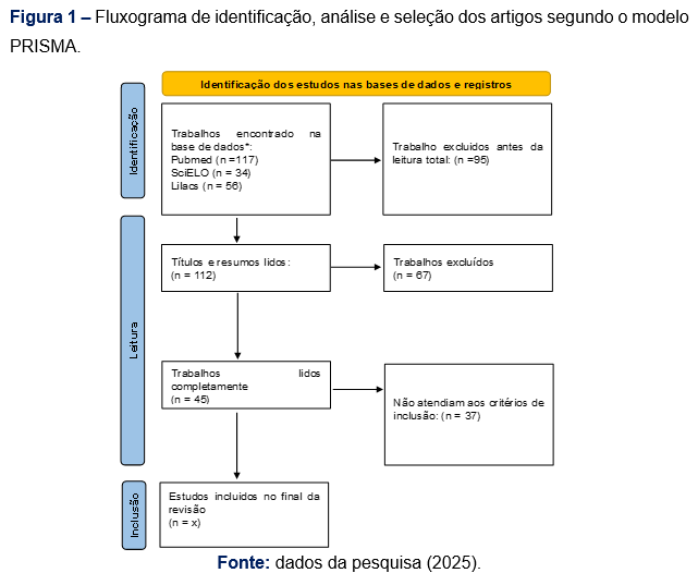 O processo de seleção seguiu o modelo PRISMA (Preferred Reporting Items for Systematic Reviews and Meta-Analyses). Inicialmente, foi realizada a identificação dos artigos nas bases de dados, seguida da triagem por meio da leitura dos títulos e resumos para exclusão dos estudos não pertinentes. Em seguida, os artigos potencialmente elegíveis foram lidos na íntegra, e aqueles que atenderam aos critérios previamente estabelecidos foram incluídos na revisão, conforme demonstrado no Fluxograma da Figura 1.